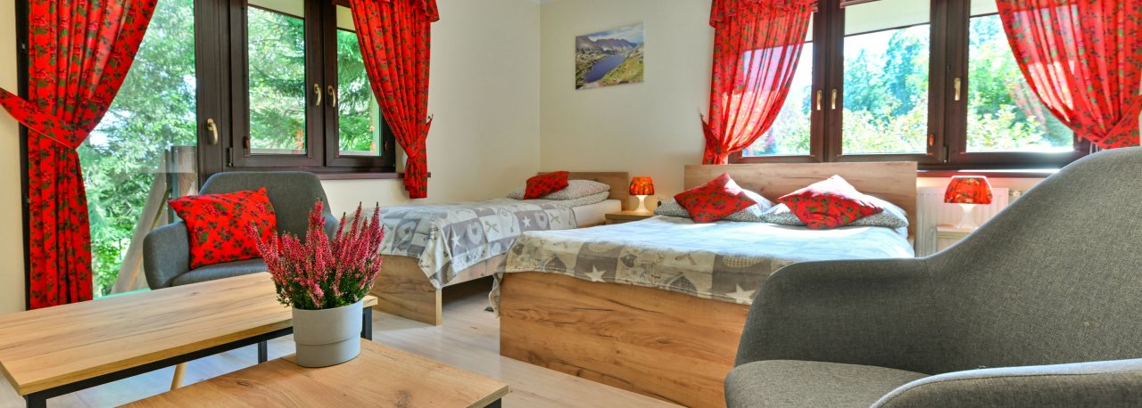 Z okien pokoju rozpościera się widok na piękną panoramęTatr, którą można podziwiać o każdej porze dnia. Balkon z meblami ogrodowymi umożliwia relaks na świeżym powietrzu i bezpośrednie wyjście do ogrodu. W pokoju znajduje się również prywatna łazienka, a zaraz obok pokoju znajduje się w pełni wyposażony aneks kuchenny, dostępny dla Gości w każdej chwili. Wielkość pokoju ok 27m²