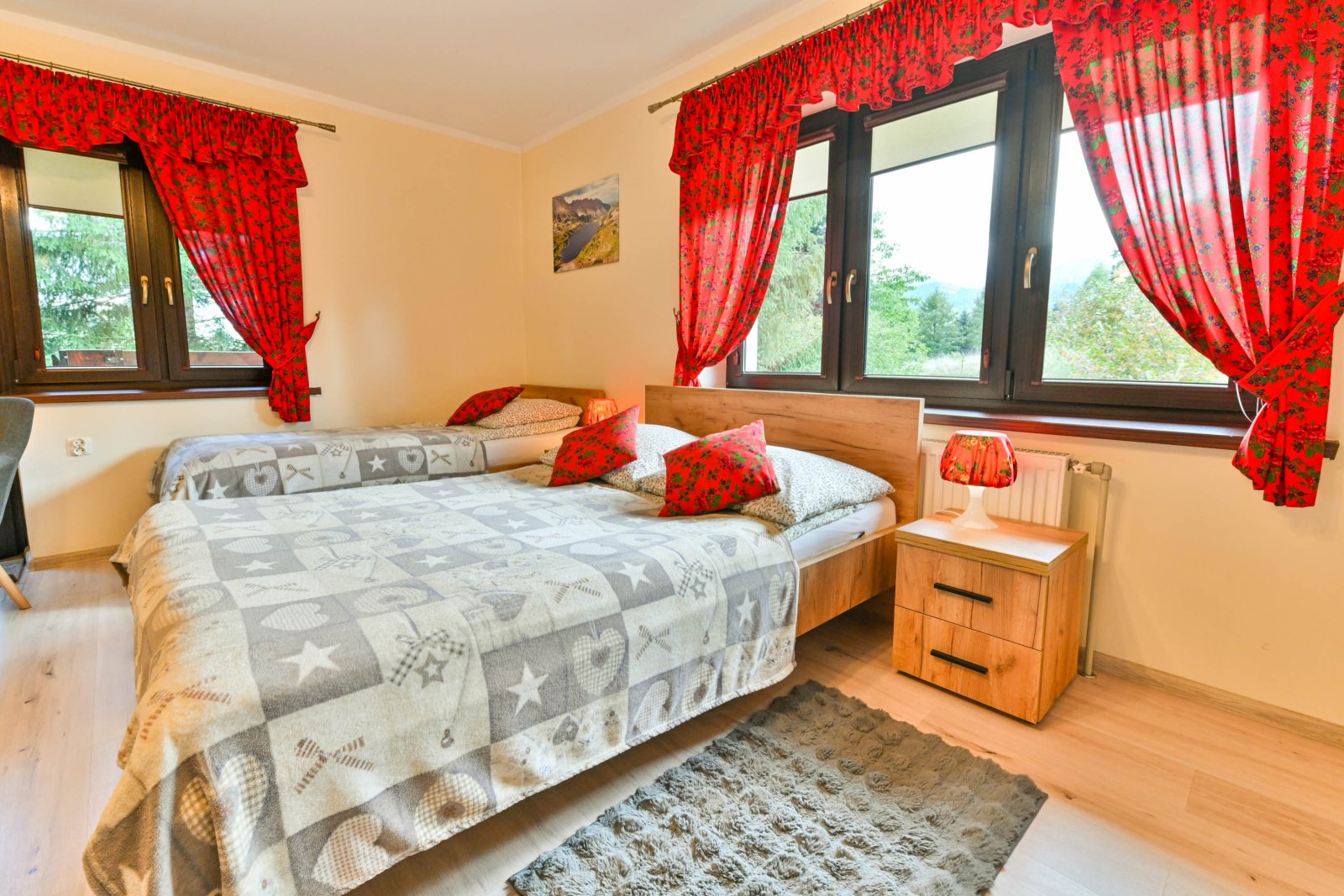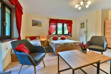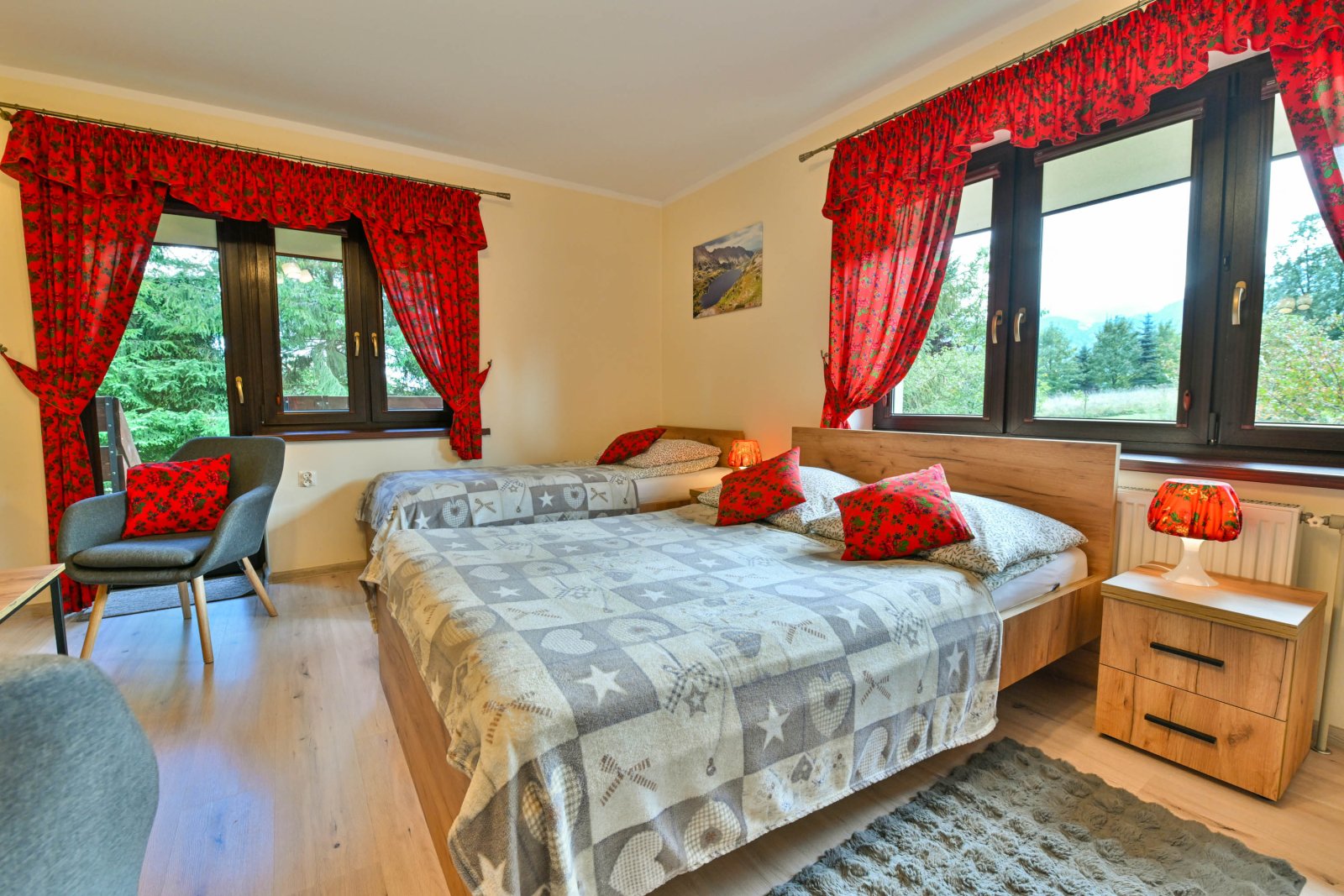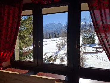 Z okien pokoju rozpościera się widok na piękną panoramęTatr, którą można podziwiać o każdej porze dnia. Balkon z meblami ogrodowymi umożliwia relaks na świeżym powietrzu i bezpośrednie wyjście do ogrodu. W pokoju znajduje się również prywatna łazienka, a zaraz obok pokoju znajduje się w pełni wyposażony aneks kuchenny, dostępny dla Gości w każdej chwili. Wielkość pokoju ok 27m²