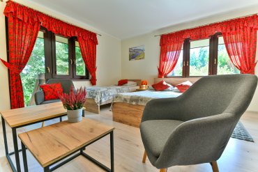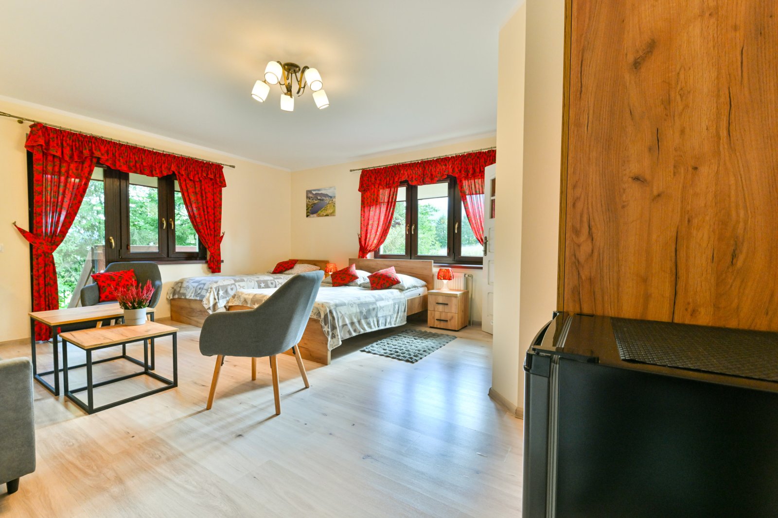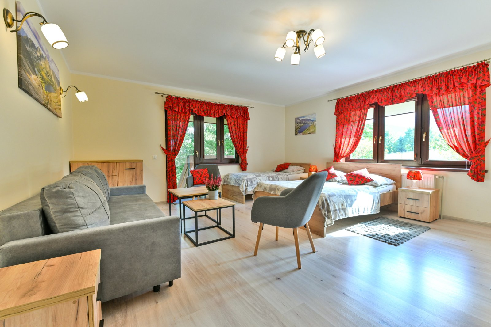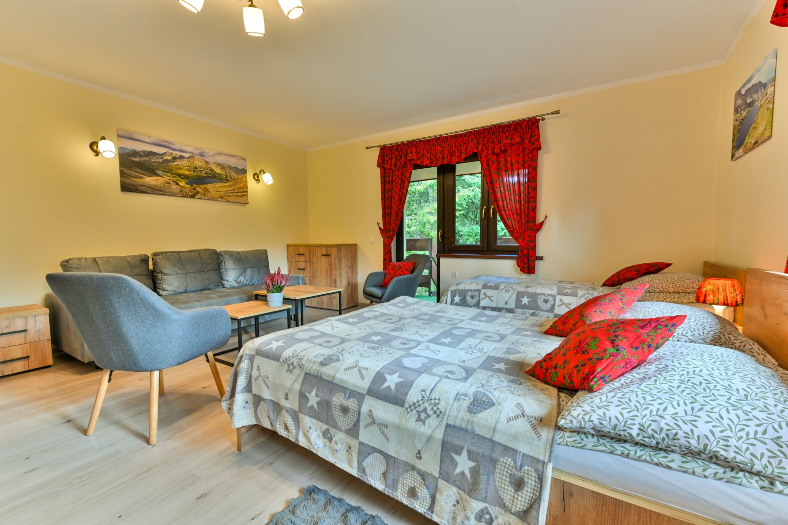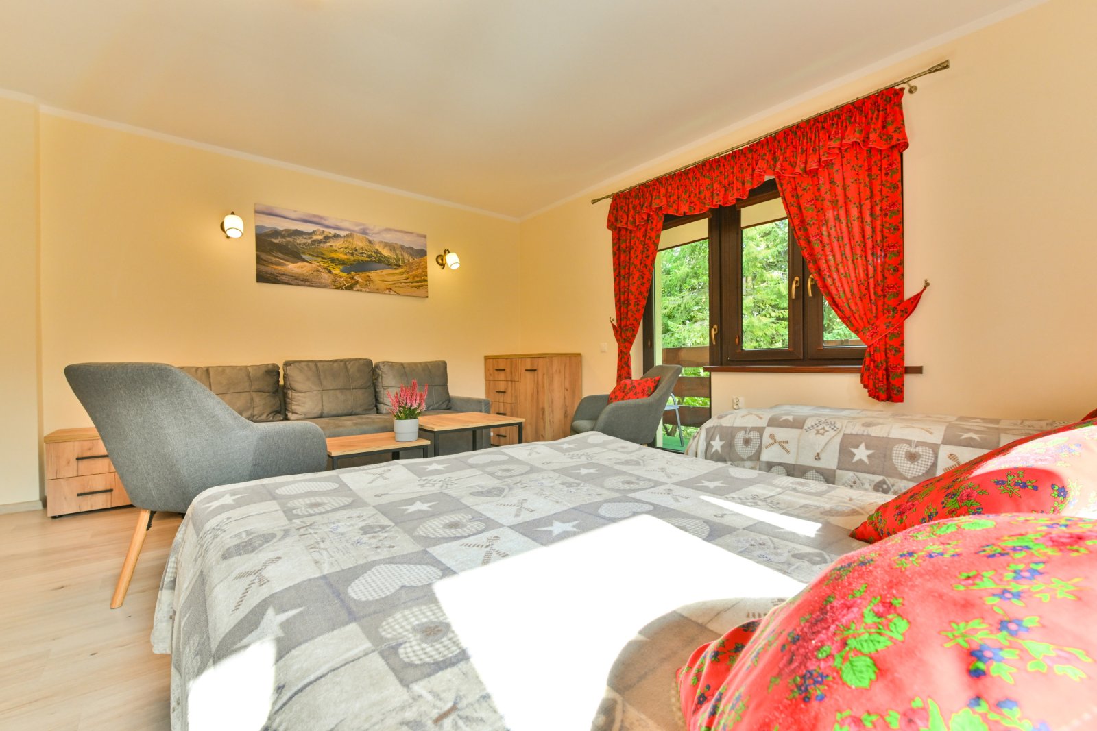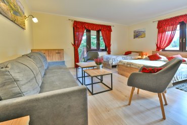 Maksymalne obłożenie: 5 osób (3 osoby na łóżkach + 2 dzieci na rozkładanej sofie). Cena od 90 zł/os.