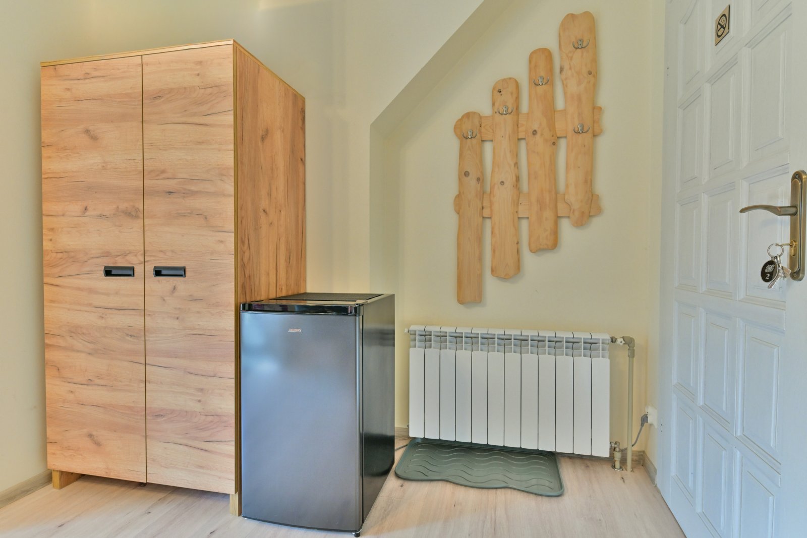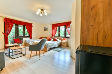 Przestronny i komfortowy pokój trzyosobowy typu Komfort to idealne miejsce dla rodzin lub grupy przyjaciół. Wyposażony w łóżko małżeńskie, pojedyncze łóżko, rozkładaną sofę, szafki nocne, praktyczną szafę, stolik oraz fotele, a także lodówkę i zestaw do parzenia herbaty, zapewnia wygodę i funkcjonalność podczas całego pobytu.