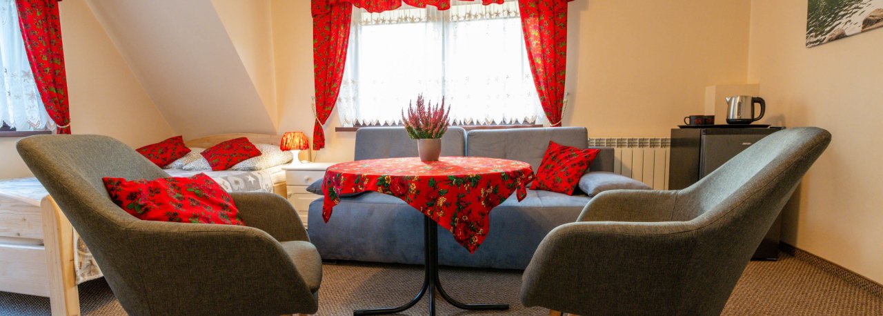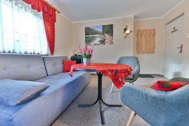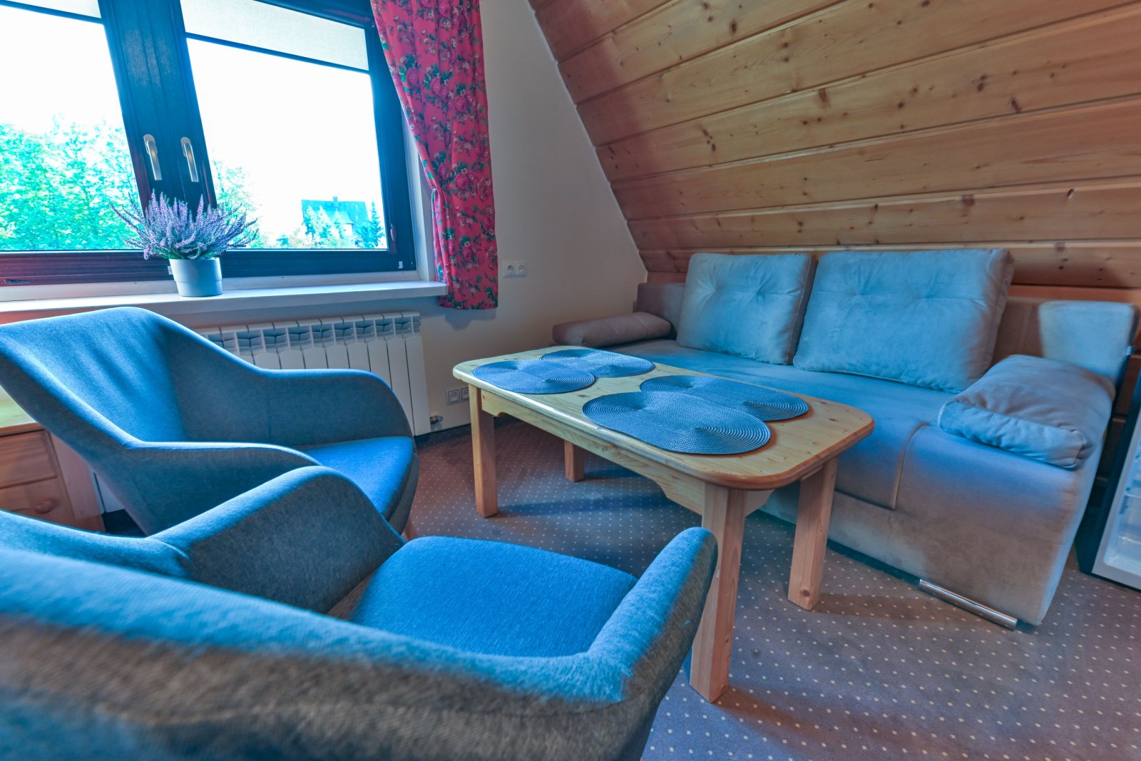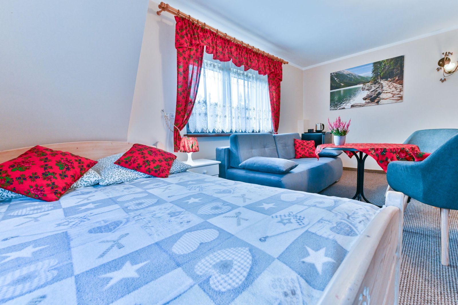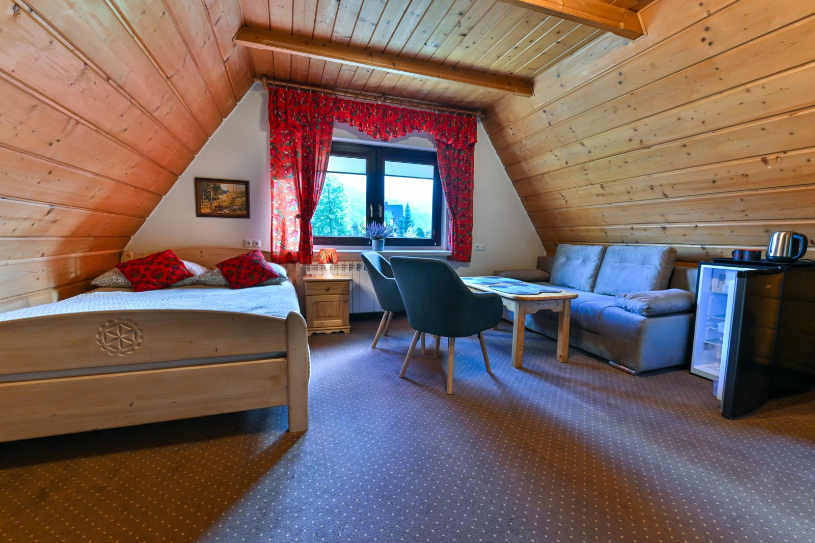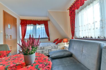 Maksymalne obłożenie: 4 osoby (2 osoby na łóżku + 2 osoby na rozkładanej sofie). Cena od 90 zł/os.