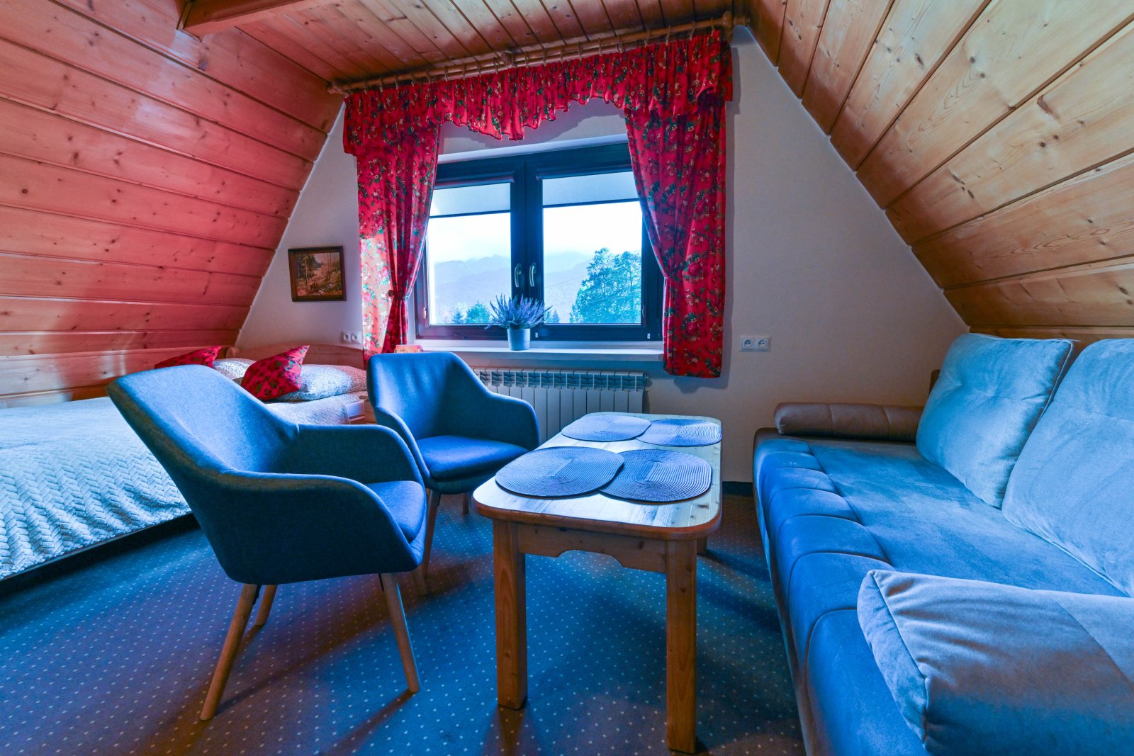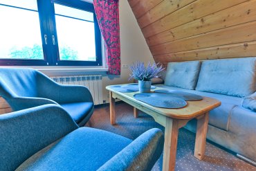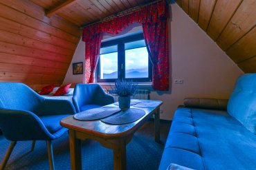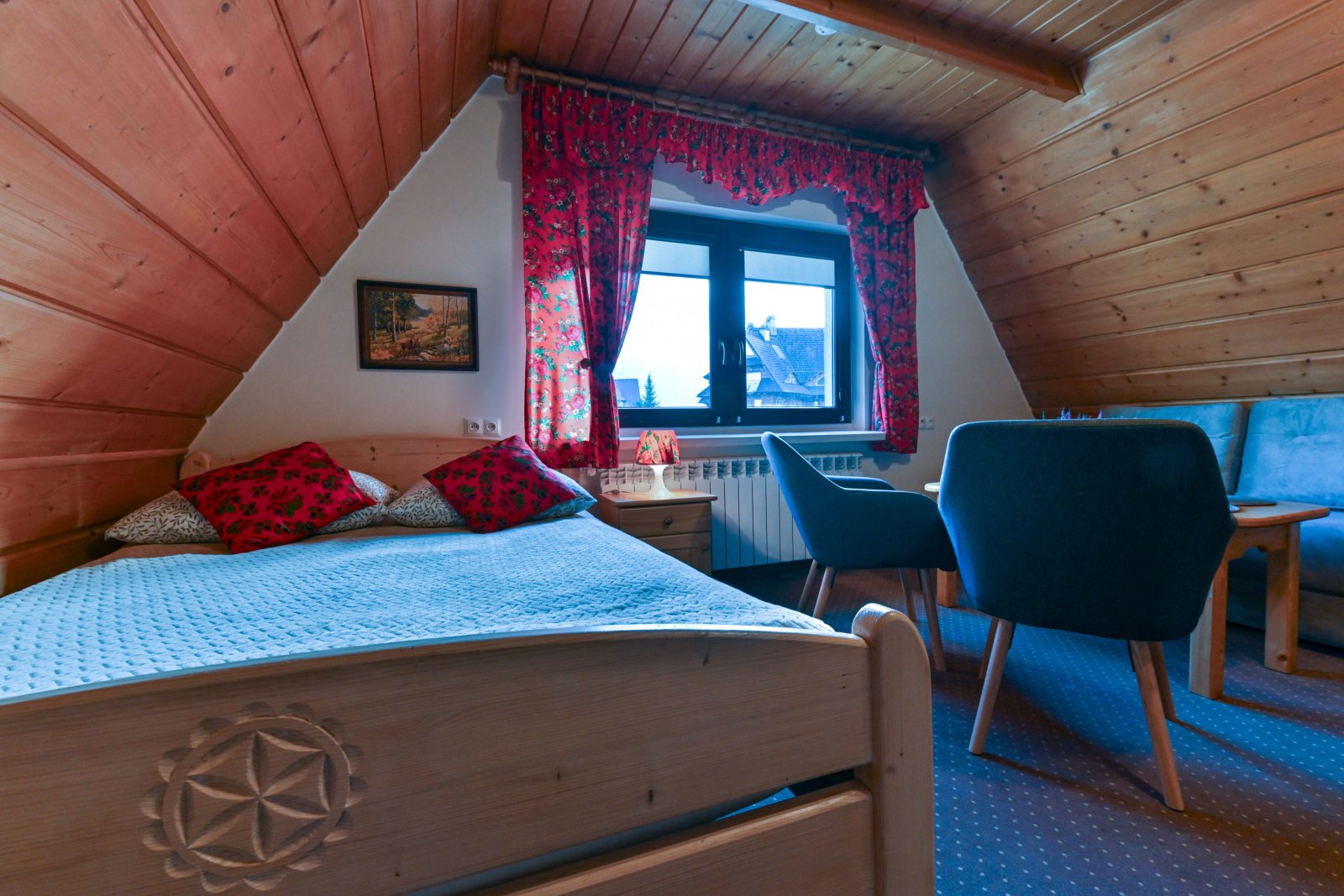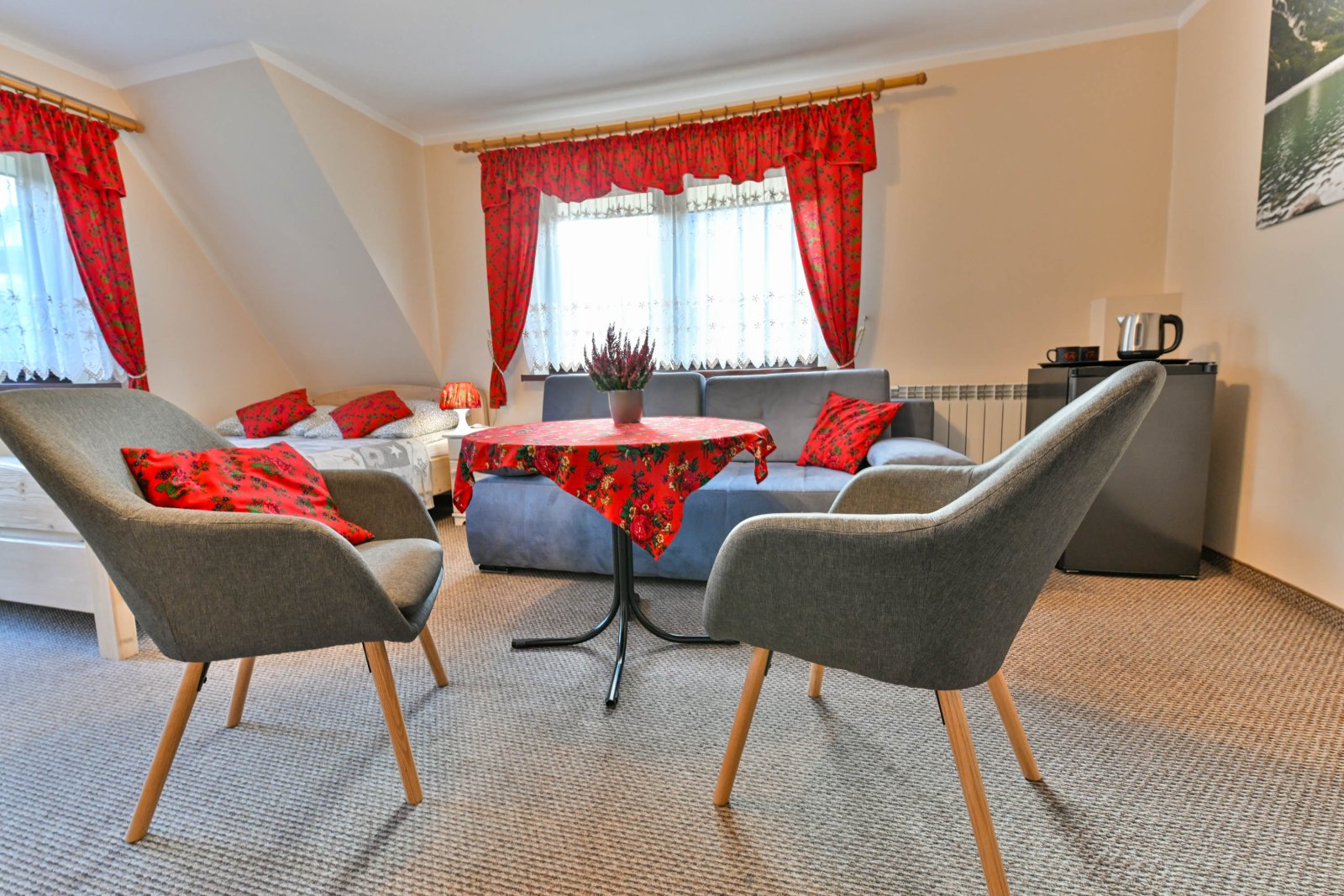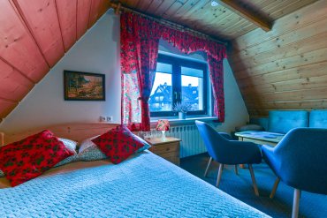Maksymalne obłożenie: 4 osoby (2 osoby na łóżku + 2 osoby na rozkładanej sofie). Cena od 90 zł/os.