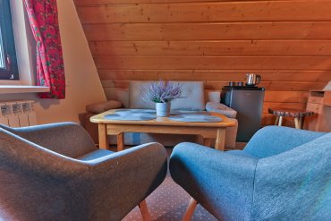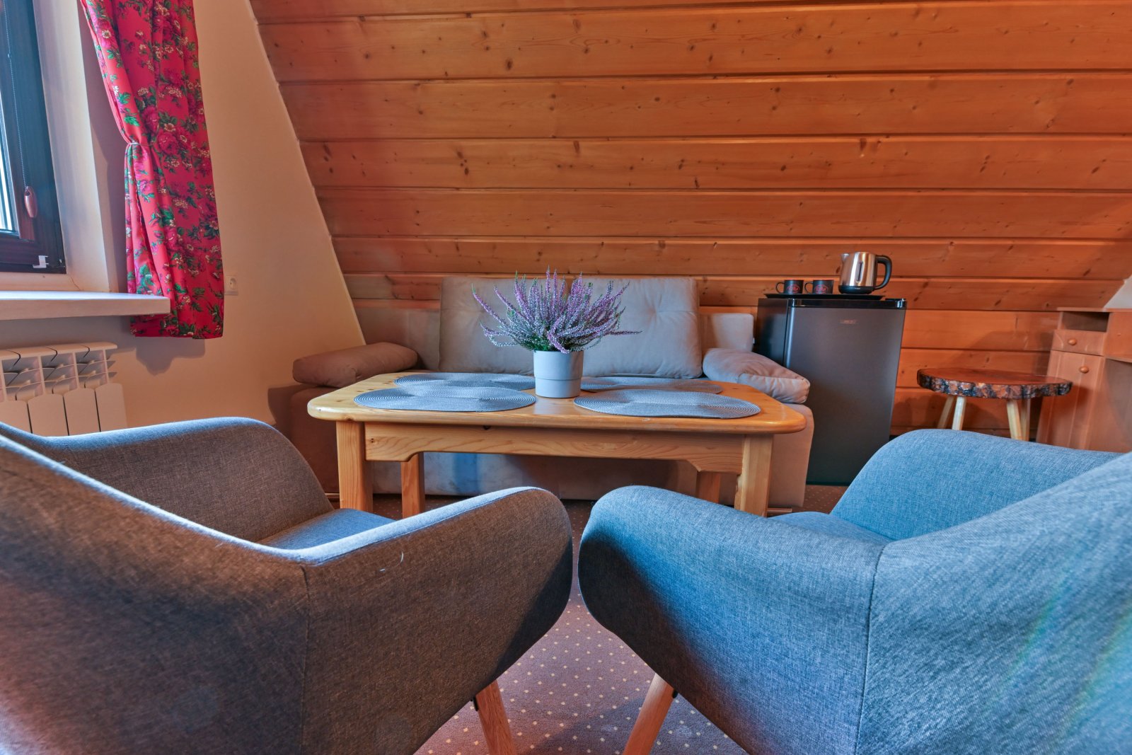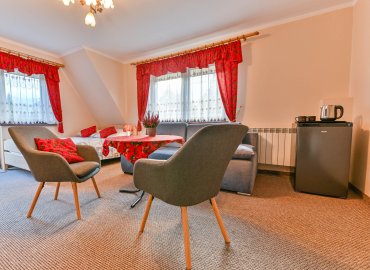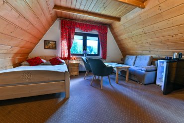 Elegancki i przestronny pokój typu Komfort to idealne miejsce dla par i rodzin, które szukają komfortu i wygody podczas pobytu. Wyposażony w łóżko małżeńskie, rozkładaną sofę, szafki nocne, praktyczną szafę, stolik oraz fotele, a także lodówkę i zestaw do parzenia herbaty, zapewnia pełen komfort i funkcjonalność. Wielkość pokoju ok 21m²