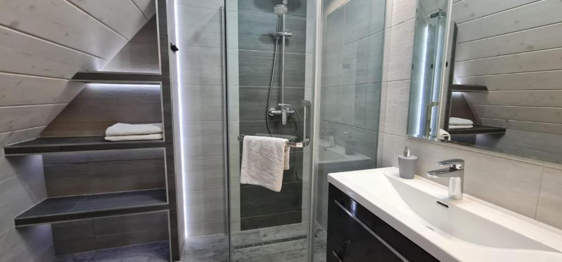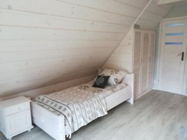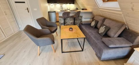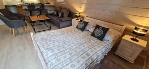 Wnętrze utrzymane jest w nowoczesnym góralskim stylu, łączącym tradycyjne, regionalne akcenty z funkcjonalnością i komfortem. Apartament wyposażony jest w łóżko małżeńskie, łóżko pojedyncze, rozkładaną sofę, szafki nocne, szafę, stolik i fotele, co zapewnia wygodę i swobodę podczas całego pobytu.
