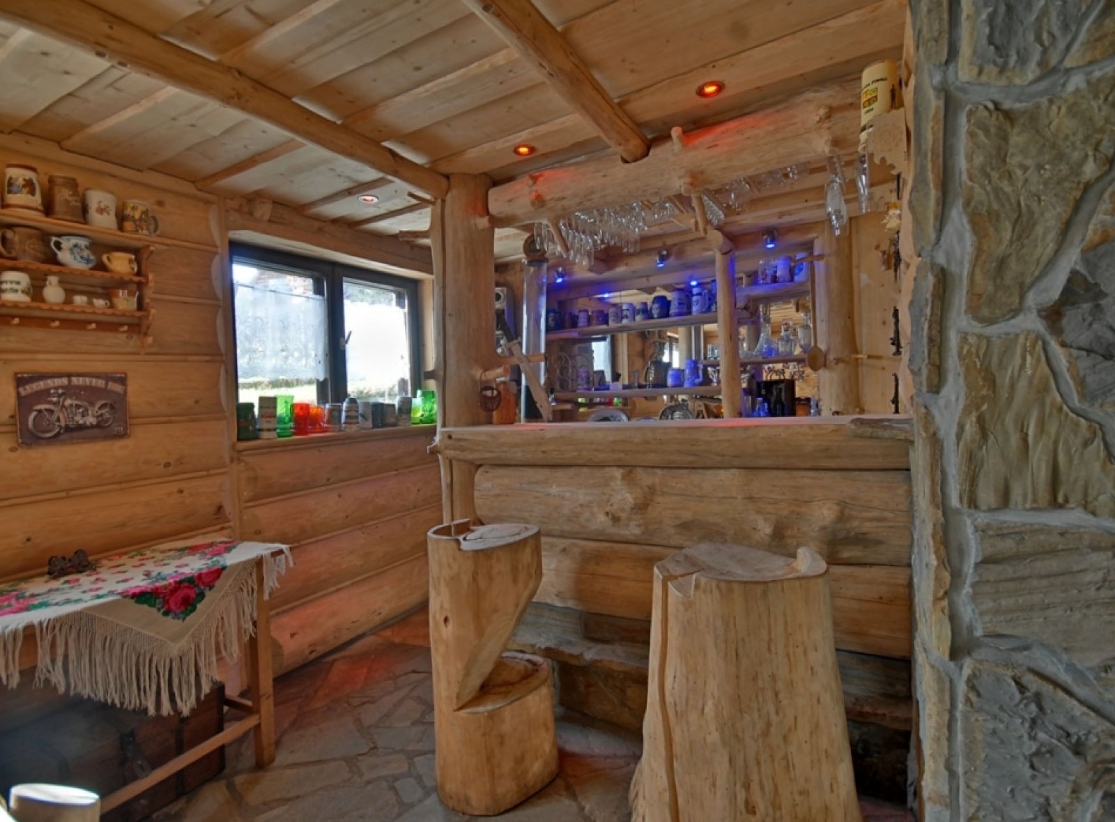W centralnym punkcie sali znajduje się kominek, którego ciepło i migotanie płomieni wprowadzają wyjątkowy nastrój. To miejsce, gdzie można odpocząć, porozmawiać z bliskimi lub po prostu delektować się spokojem i ciepłem ognia, otoczonym autentycznym góralskim klimatem.